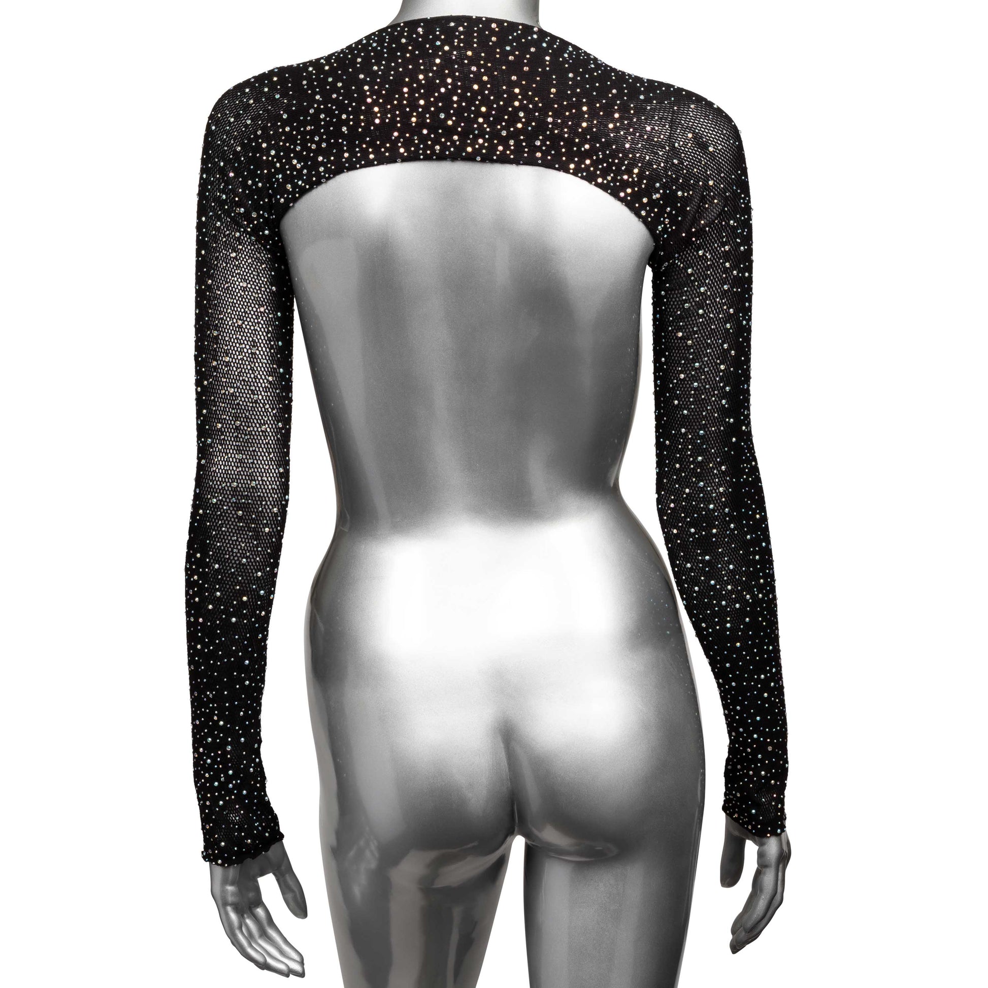 Unleash her inner goddess with the Enchanting Radiance Shrug: Ignite Their Desire in Black. As she slips into this mesmerizing piece, watch her transform into a vision of allure and power. The delicate, breathable mesh caresses her skin, while sparkling rhinestones dance with every move, capturing the light and your attention. This seductive shrug wraps her in a promise of passion, inviting you to explore every curve and contour.